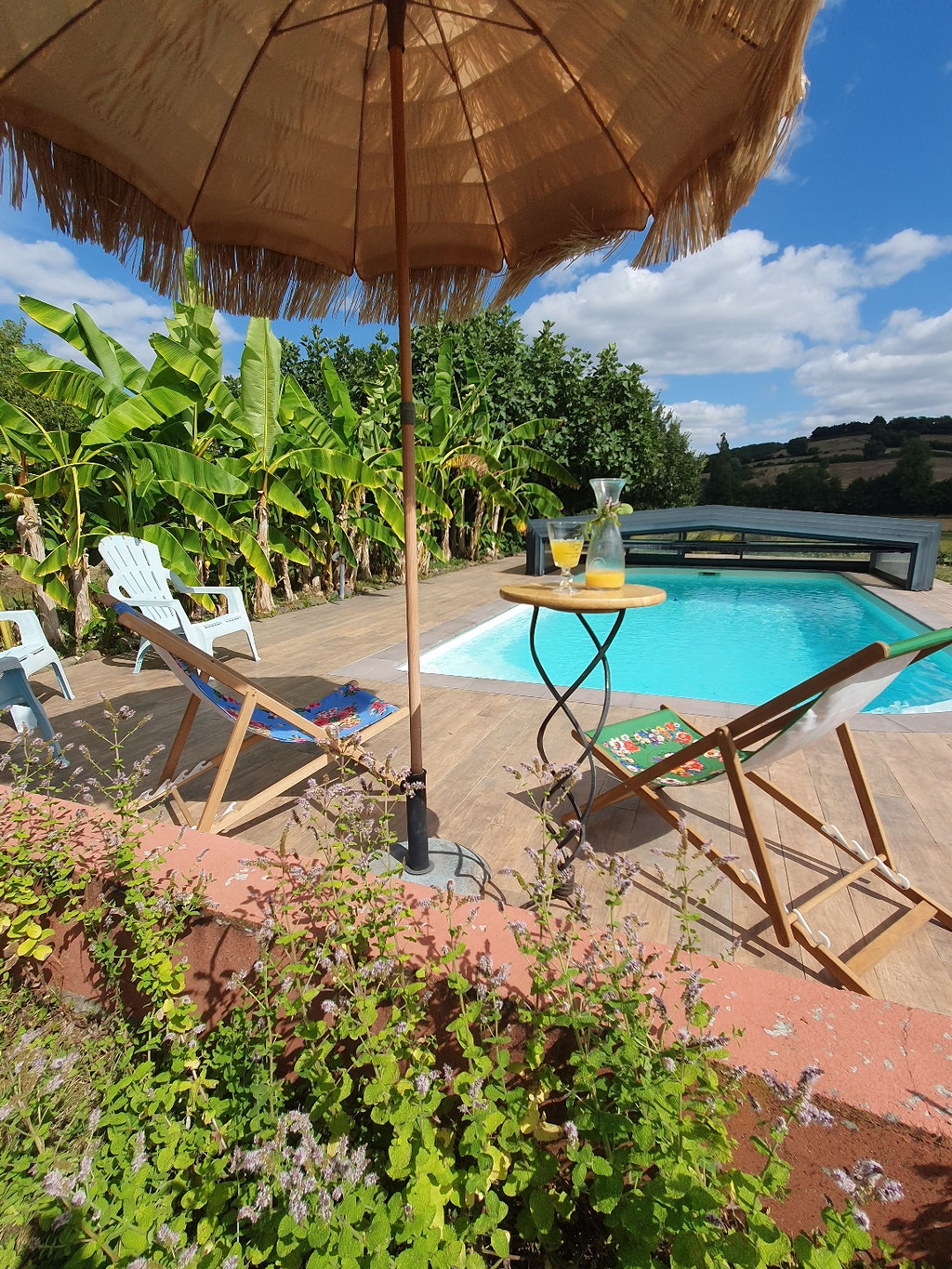 Située en retrait de la maison face aux collines, bordée de plantes exotiques, vous pourriez presque vous imaginer sous les tropiques ! Venez vite profiter de ce cadre exceptionnel !